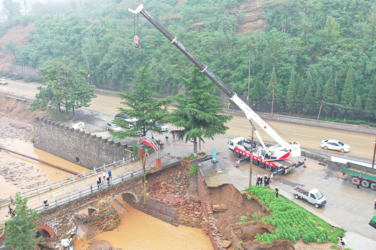 救援队首先抵达小关镇口头村一河道处,当日河道内淤泥堵塞严重,并且伴有上游随水流冲下的垃圾,桥下方有几颗树木陷入淤泥中,需要及时把树木清理出去,疏通河道。集团领导亲自现场指挥,部署清理任务。