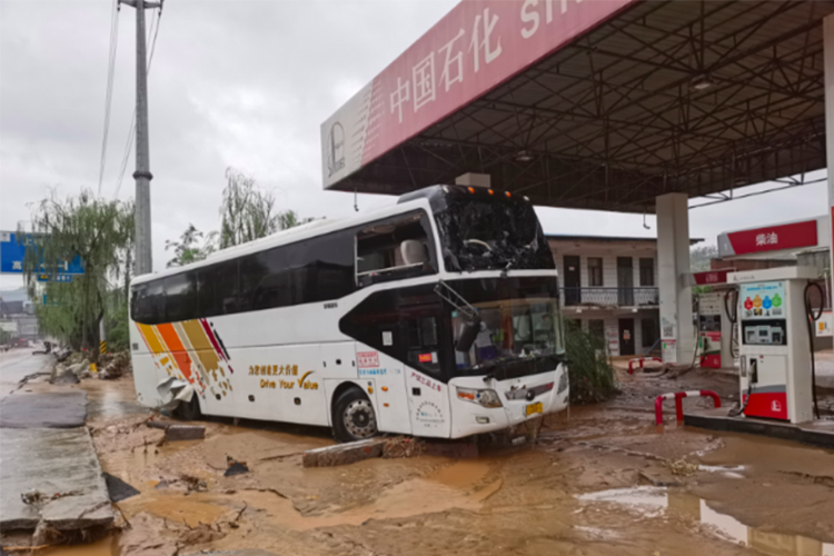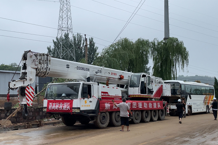 7月20日,郑州航空工业管理学院70余名硕士博士生结束为期一周的入职培训,分乘两辆大巴车经310国道自巩义市竹林镇返回郑州。车辆驶至巩义市米河镇高庙村时遭遇山洪,水深升至1.7米左右。两辆大巴车进水、受损严重,漂在水上难以动弹。危急时刻,一名在附近公司避险的青年急中生智,接通电源线打火,启动铲车,用铲斗将被困人员救至安全地带。事件结束后,被困车辆深陷淤泥,尚未拖至安全位置,新高耐集团救援队在疏通河道结束后火速赶到米河镇,救援被困车辆。