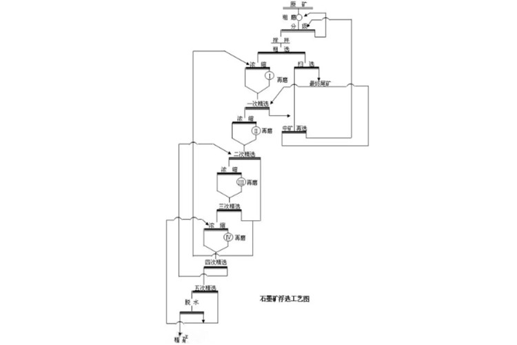 石墨矿石的硬度一般为中硬或中硬偏软,一般粗碎多采用颚式破碎机,中、细碎多采用圆锥破碎机或锤式破碎机;磨矿采用湿式球磨机、格子型球磨机;浮选常用JJF型、XCF型、XJB型浮选机;选矿脱水常用水力旋流器或带式压滤机。